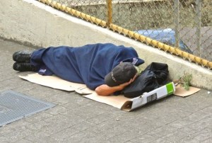 On the street around 7am, I leave the car in a parking lot and head out with a jammed-full backpack. I take safety precautions, but since I go out early, most of them are still docile after their Saturday night. The street people migrate from one spot to another, so they aren’t necessarily where I last left them. It takes a second for the brain to register, That pile of rags is a man; that cardboard box is someone’s house.