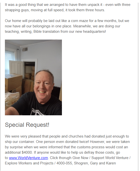 • OR Make a donation online at www.WorldVenture.com. Click on the following buttons beginning on the first page: How to Give, under Support World Venture click Give Now, select an amount, click Next, click on Select a Worker or Project, scroll down the list to find and click on our account 4000-055 Gary and Karen Shogren, click Next, and fill out the remainder of the form and information.