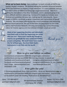 Not everyone can hear us give a full description of what we do, so it seems like a good time to give an overview. The video is from a missionary conference in Chester, Pennsylvania from 2022. (By the way, if you have been following my updates about my Spanish-language Bible study, it takes place at this same congregation). The video describes my teaching in ESEPA seminary, my books (most of which you can get on Amazon), my work editing the Bible in the SUN language for the 60 million deaf non-readers around the world. Karen gives details about her ministry “Levanta La Voz” (Raise Your Voice), which specializes in preventing sexual abuse in the church. I then conclude with thoughts about a favorite Bible prophecy, Matthew 24. Enjoy! Gary and Karen